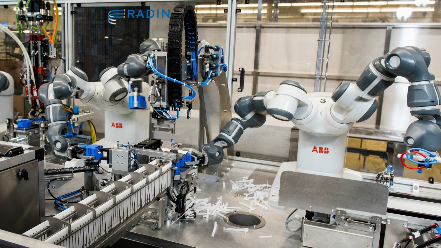 De nieuwste generatie holle wanddozen van ABB worden samengesteld door drie robots die innig samenwerken. In de fabriek in Ede voltrekt zich niet minder dan een primeur.