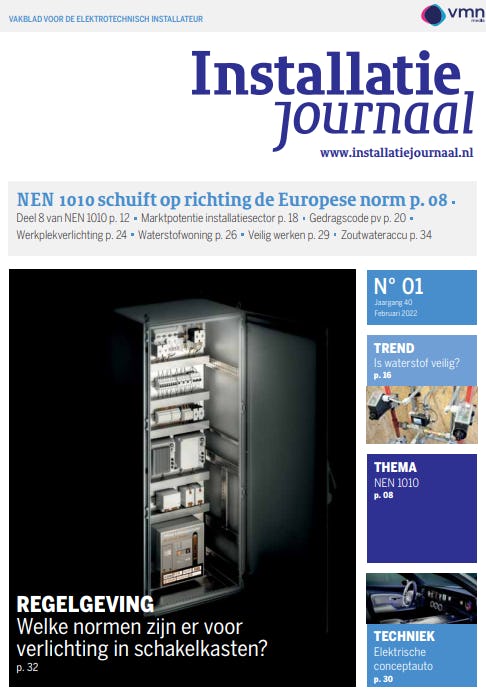 In deze editie o.a. NEN 1010 schuift op richting de Europese norm, Deel 8 van NEN 1010, Marktpotentie installatiesector, Gedragscode pv, Werkplekverlichting, Waterstofwoning, Veilig werken, Zoutwateraccu, Is waterstof veilig, Elektrische conceptauto.
