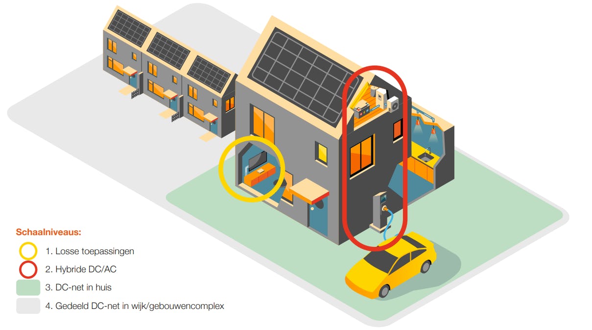 DC-toepassingen in woning en utiliteit kunnen mogelijk zorgen voor minder energieverliezen. Ook kan er materiaal uitgespaard worden en is apparatuur makkelijker te sturen, actief dan wel passief. Deze sturing heeft als potentieel voordeel een betere afstemming met opwek achter de meter en het voorkomen van congestie op het net. De adoptie van DC in woningen en utiliteit heeft wel een aantal knelpunten.