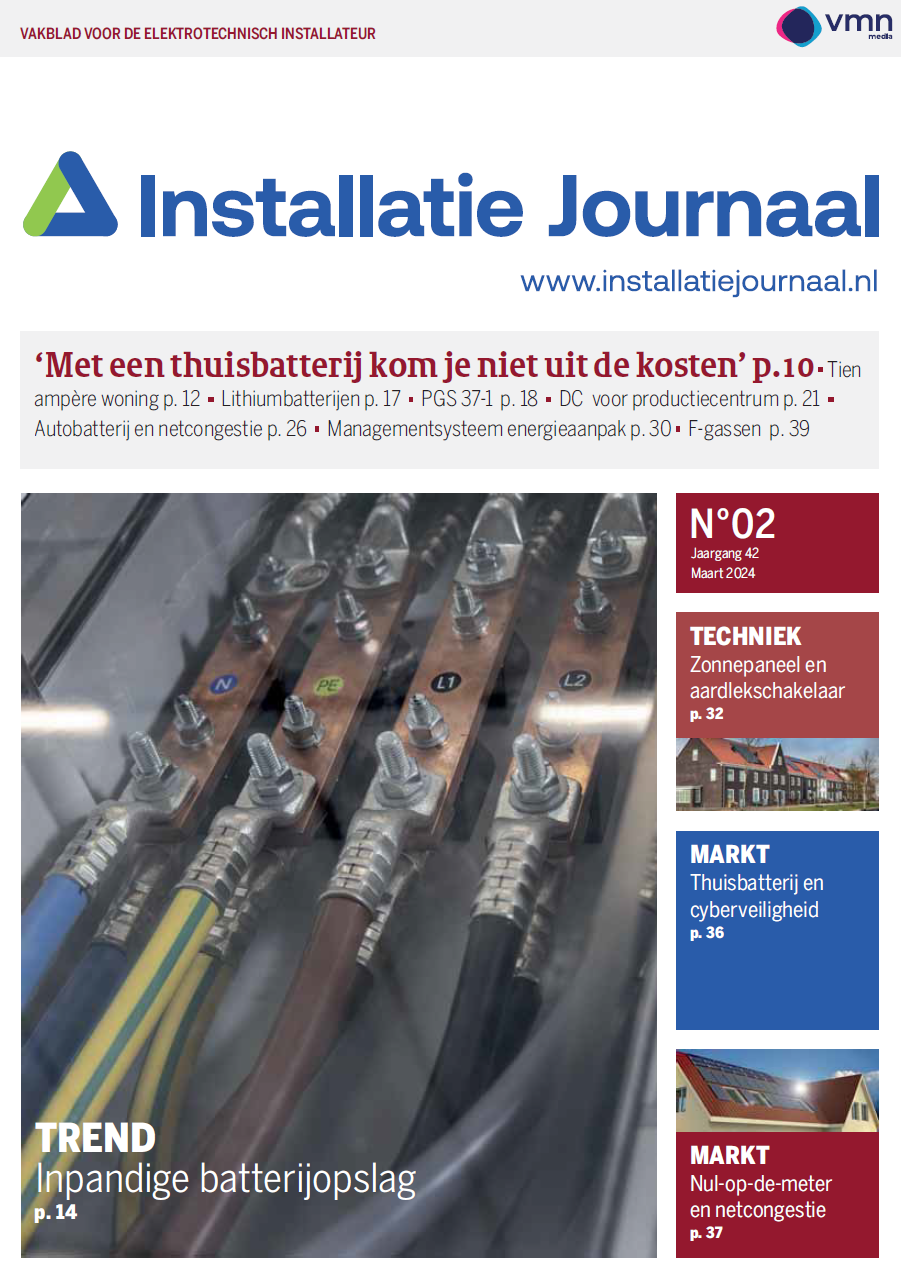 In deze editie o.a. 'Met een thuisbatterij kom je niet uit de kosten' p.10 Tien ampère woning p. 12 Lithiumbatterijen p. 17 PGS 37-1 p. 18 DC voor productiecentrum p. 21 Autobatterij en netcongestie p. 26 Managementsysteem energieaanpak p. 30 F-gassen p. 39