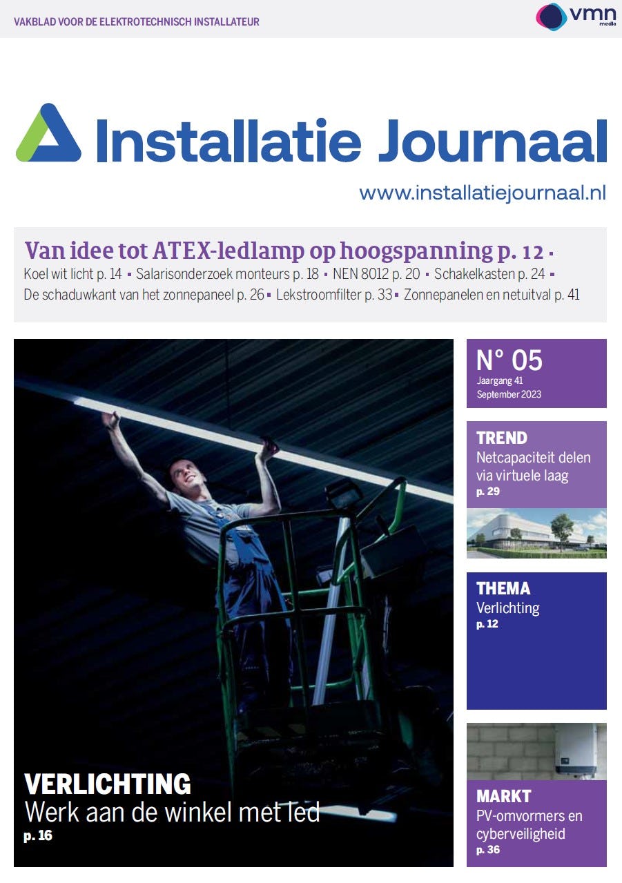 In deze editie o.a. Van idee tot ATEX-ledlamp op hoogspanning p. 12 Koel wit licht p. 14 Salarisonderzoek monteurs p. 18 NEN 8012 p. 20 Schakelkasten p. 24 De schaduwkant van het zonnepaneel p. 26 Lekstroomfilter p. 33 Zonnepanelen en netuitval p. 41