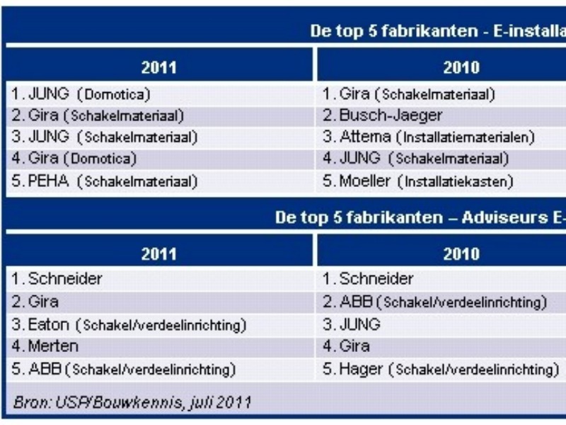 E-installateurs zijn het meest tevreden met Jung. Dit blijkt uit de Marketing Score Card Installatie- Klanttevredenheid 2011van Bouwkennis. E-adviseurs waarderen Schneider het meest.