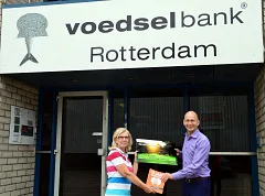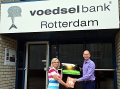 Wolter & Dros heeft Voedselbank Rotterdam een cheque ter waarde van 2.230 euro gegeven. Jean-Paul Sosef, regiodirecteur West bij Wolter & Dros, overhandigde de cheque eergisteren aan Annelies Brands van Voedselbank Rotterdam.