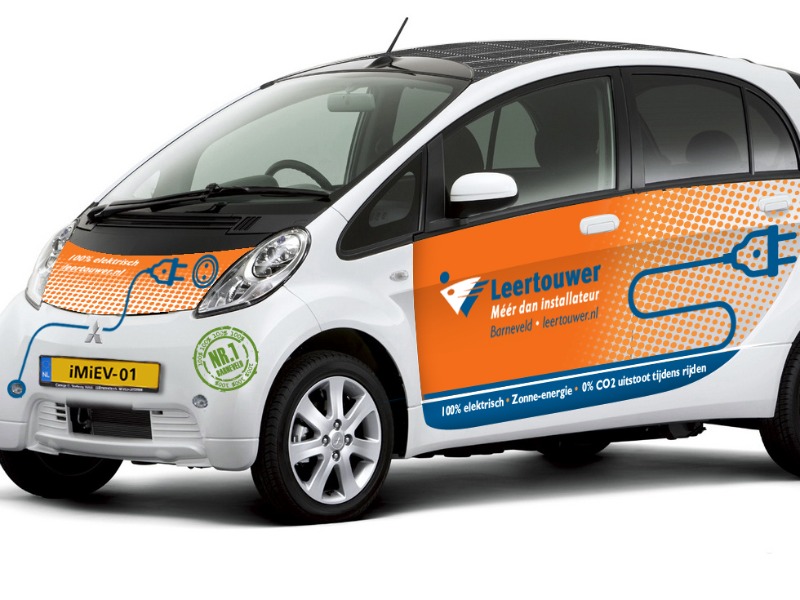 Leertouwer rijdt de eerste elektrische auto in Barneveld. het gaat om een Mitsubishi ImieV. Leertouwer levert zelf de elektrische energie.