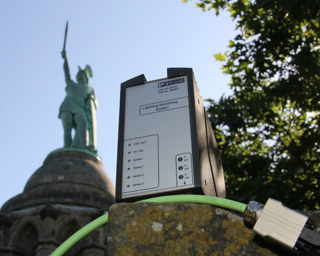 Het standbeeld van Arminius in Detmold (D) is voorzien van drie sensoren van het bliksemmeetsysteem Lightning Monitoring System LM-S. Phoenix Contact ontwikkelde het systeem. Het monument dient als demonstratie- en onderzoeksobject.