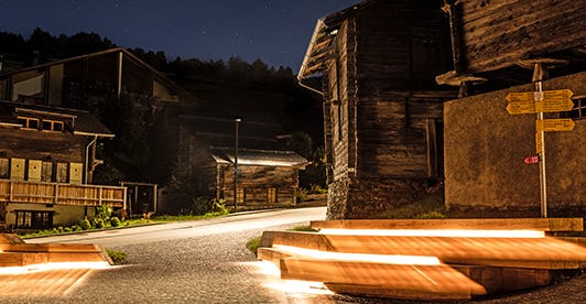 Zumtobel verlicht het nieuwe dorpsplein in Bürchen in het Zwitserse kanton. De nieuwe verlichting geeft volgens Zumtobel het plaatsje 's nachts een mystieke sfeer.